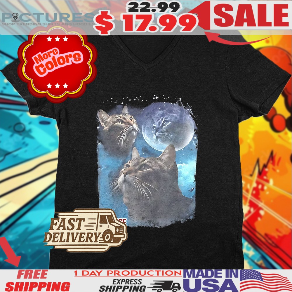 - Eye-Catching Design: Featuring three cats in a howling pose against a whimsical moon backdrop, this shirt is designed to grab attention and elicit smiles. Showcase your love for cats and memes with a fun and stylish graphic that resonates with fellow animal lovers.