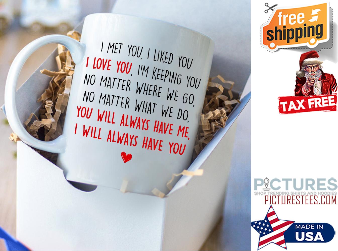 I met you I like you I love you I will always gave you Valentine’s day mug, Ceramic mug, Travel Mug, Enamel mug, Accent Handle mug, Coffee mug, Tee Mug, Black mug, White mug, Handle color mug, Red handle mug, Yellow Handle mug, Customized mug, Personalization mug, Custom name mug, customizable mug