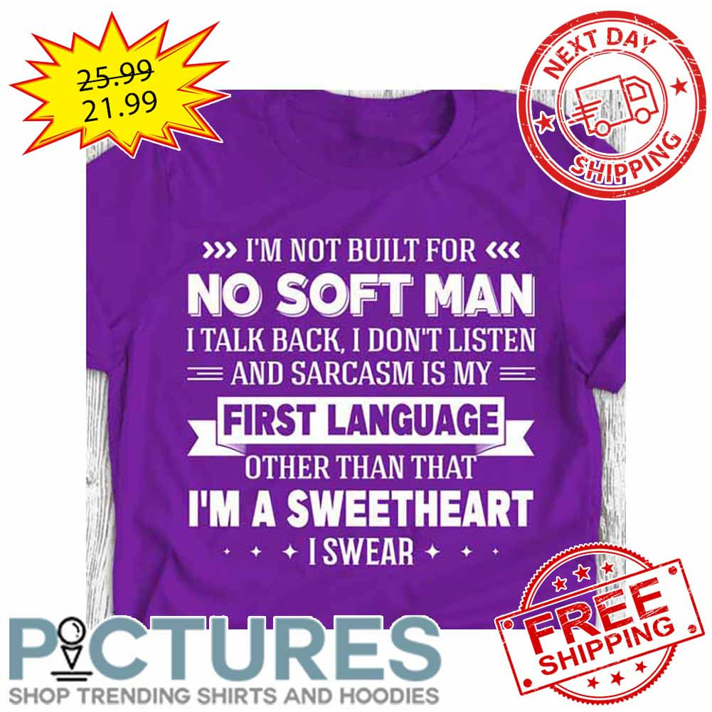 I’m Not Built For No Soft Man I Talk Back I Don’t Listen And Sarcasm Is My First Language Other Than That I’m A Sweetheart I Swear shirt
