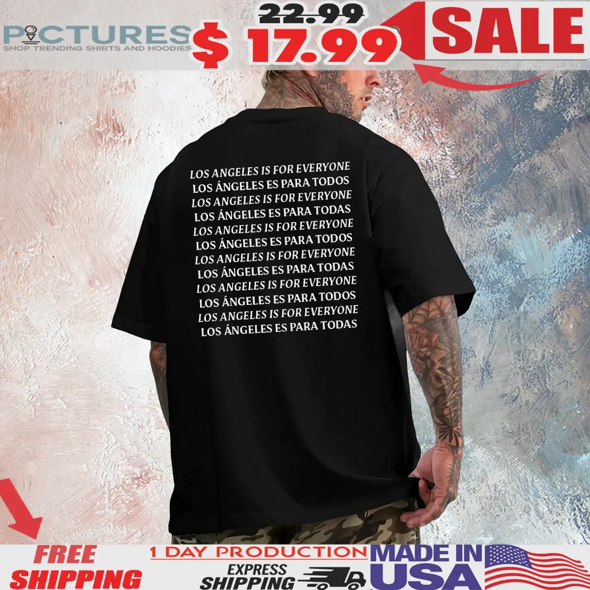 – **Inclusive Design:** Features bold, bilingual text “Los Angeles is for Everyone / LA Es Para Todas” that promotes diversity and unity, allowing you to express your support for an inclusive community effortlessly.