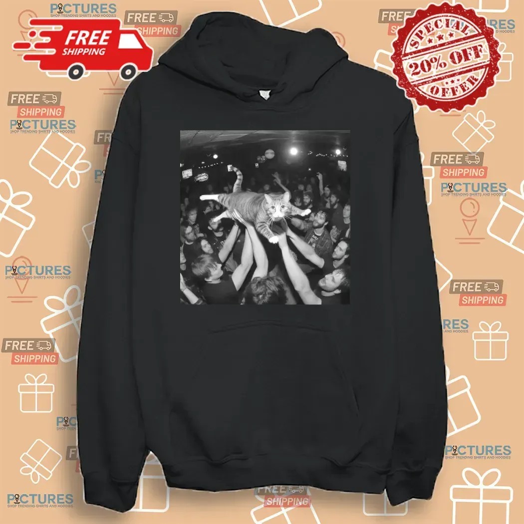 Rock Show Cat Tabby Crowd Surfing Meme T Shirt , hoodie, sweatshirt, cropped tee, youth tee, infant baby bodysuit