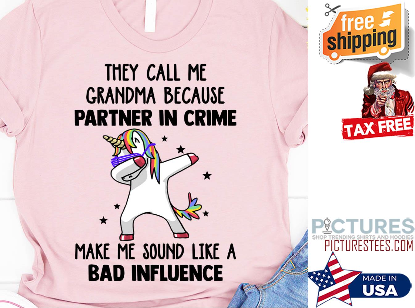 Unicorn they call me grandma because partner in crime make me sound like a bad influence shirt, hoodie, tank top, sweater and long sleeve t-shirt